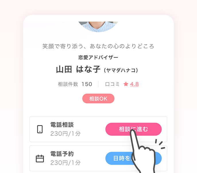 恋愛相談METHODにはプロとして活躍されている選りすぐりの恋愛アドバイザーや心理カウンセラーはもちろん、厳しい審査を通過したインフルエンサーなどが所属しております。筋立った解決のご提案はもちろんのこと、人柄やトーク力、寄り添いの御心等も含めて高い水準をクリアした相談員がお客様のお悩みをお伺いいたします。はじめての電話相談でご不安に思われる場合は、お電話をおかけになる前にご相談内容をメモしておくとスムーズに話が進められる上に、お時間も有効に使うことができるかと思います。